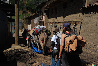 The next day, with little sleep and a lot of baggage, we made our way to the tiny village of LIamac , Fanny’s hometown, to get our donkeys and start our trek. With some help from her family, Fanny loaded the 3 donkeys, (with comments which repeated themselves along the journey from man porters who said they have never seen a womyn be a donkey porter before). The three donkes were marked with a bright orange spray so that we would recognize them along our trek. We left off at 1:40 pm. with smiles and clean shoes.
