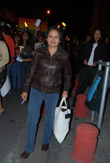 Y nuestra admiración por esta gran persona se incremento aun mas (ya nos sentíamos tan afortunadas de poder escuchar todo lo que nos había compartido), cuando nos conto sobre sus experiencias con violencia. ¨Yo soy una persona No violenta porque viví mucha violencia. Así ya como dos años tuve un incidente de violación. Un día, unos tipos entraron en nuestra casa, se robaron todo, y nos violaron, fue muy feo… Yo me morí en el momento en que pasaba esto. Me desconecté. Después de esto yo no sentí la culpa que supuestamente tenia que sentir, cuando te violan supuestamente te tienes que sentir muy culpable, sentirte sucia y sentir que tu cuerpo y no se que. Pero yo no sentía eso… Sentía una frustración de no haber podido hacer nada, ¿había sido correcto que yo me haya muerto en esos momentos, o tenia que haber luchado por mi?... ¡Pero yo no sentía vergüenza! Lo que no me gusta es producir Pena. La pena a mi me pone mal. Lo que yo quise hacer después de esto es organizar una fiesta de Sanación para contar lo que había pasado y organizamos ¡una gran fiesta! …Di mi testimonio y dije que no quería ser victima, que ya me habían violado y eso era suficiente! Cuando di mi testimonio yo sentía que la gente había entendido lo que había pasado. Ese acto de sanación pública me permitió seguir en la vida aceptando que más allá de la estadística tuve la posibilidad de denunciar públicamente el tema de la No vergüenza¨.