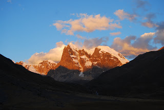 Salimos a las 9am y sabíamos que hoy sería un día más fácil que el anterior. Tuvimos la fortuna de despertarnos temprano y deleitarnos con el amanecer que se reflejaba sobre lo blanco del nevado que cubría con su sombra el azul de la Laguna Carhuacocha. Al mirar esas imagines casi surreales, supe que todo esto valía la pena, que todo lo que habíamos caminado y el tremendo frió era pequeño comparado con la enormidad de la belleza natural. Además, eran las 6 de la mañana y ya habíamos olvidado el cansancio de ayer pues el frió nos ayudaba a anestesiar el dolor.