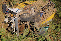Then we got more information on the accident. It just happened that the driver who hit us was drunk. A witness had seen three men come out of a bar heavily affected by alcohol consumption get on the truck. Then they heard that there was an accident and were not surprised to find out that it was the same truck that they had seen the three drunken men get into. Our bus driver told us that he saw the truck coming in the middle of the road at high speed. He flashed his high lights at the oncoming truck to indicate that we were coming and that he needed to move to the right side of the road but there was no action taken. Our driver saw that the truck was going to hit us face on so he moved to the side of the road, almost completely flipping us over the edge to prevent the accident; but the other truck hit the left side of our bus completely, starting with the driver´s window and breaking every window till the end of the bus. Afterwards the impact must have caused the other driver to lose control and they veered off into the ditch.